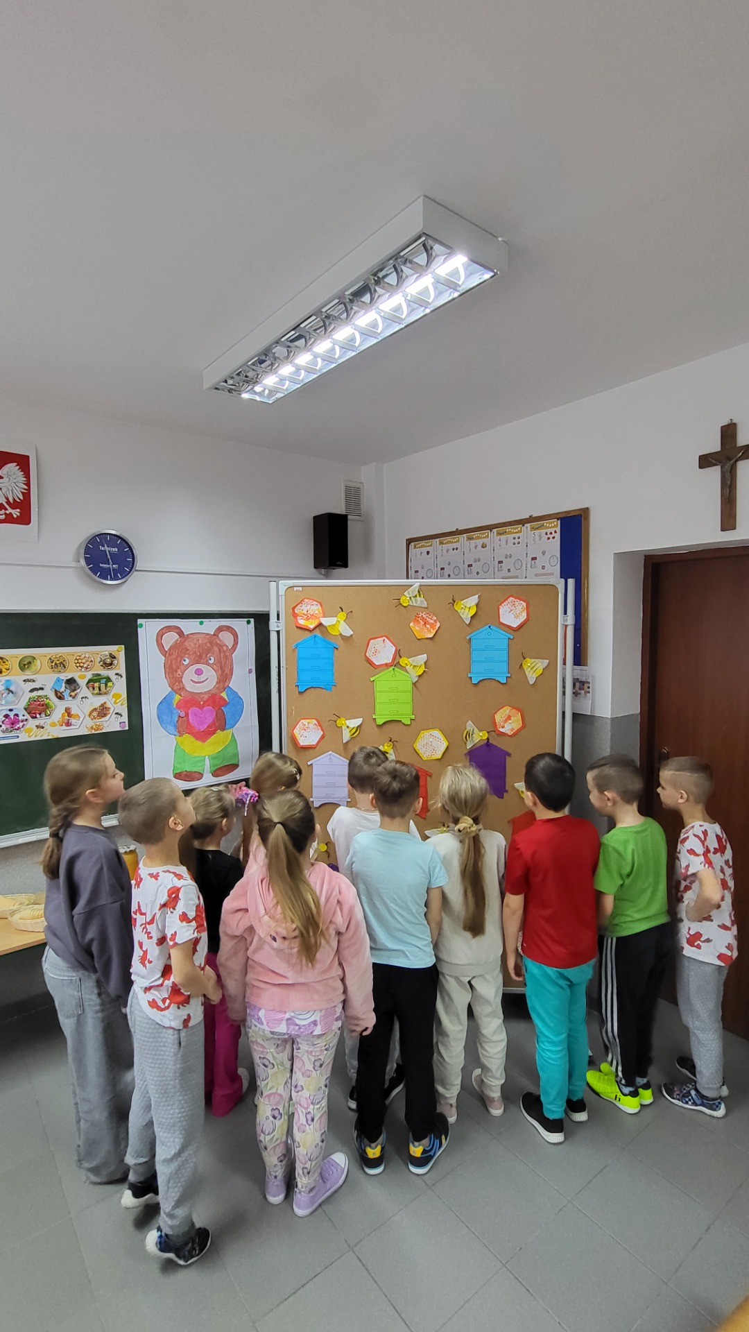 Uczniowie klasy 1 realizowali w dniach 24-28 listopada projekt edukacyjny "Nasze przyjaciółki - pszczółki". Projekt ten został stworzony, by dzieci mogły bliżej poznać życie pszczół oraz ich znaczenie w otaczającym nas świecie, jak również w życiu każdego z nas. Uczniowie poprzez poznawanie świata przyrody, pracy pszczelarza i roli pszczół dla środowiska poznali szeroki kontekst i istotę pracy tych owadów. Są one zwierzętami społecznymi, które do perfekcji opanowały umiejętność współpracy i komunikacji w dążeniu do wspólnego celu. Cechy te z kolei są bardzo pożądane w dzisiejszych czasach i warto, by dzieci już od najmłodszych lat uczyły się zachowywać właśnie w ten sposób. Niniejszy projekt miał na celu umożliwić uczniom skuteczną współpracę, porozumiewanie się w kulturalny sposób, samodzielne dochodzenie do wiedzy, poszukiwane i wykorzystywanie różnorodnych źródeł informacji oraz rozwijanie zainteresowań.